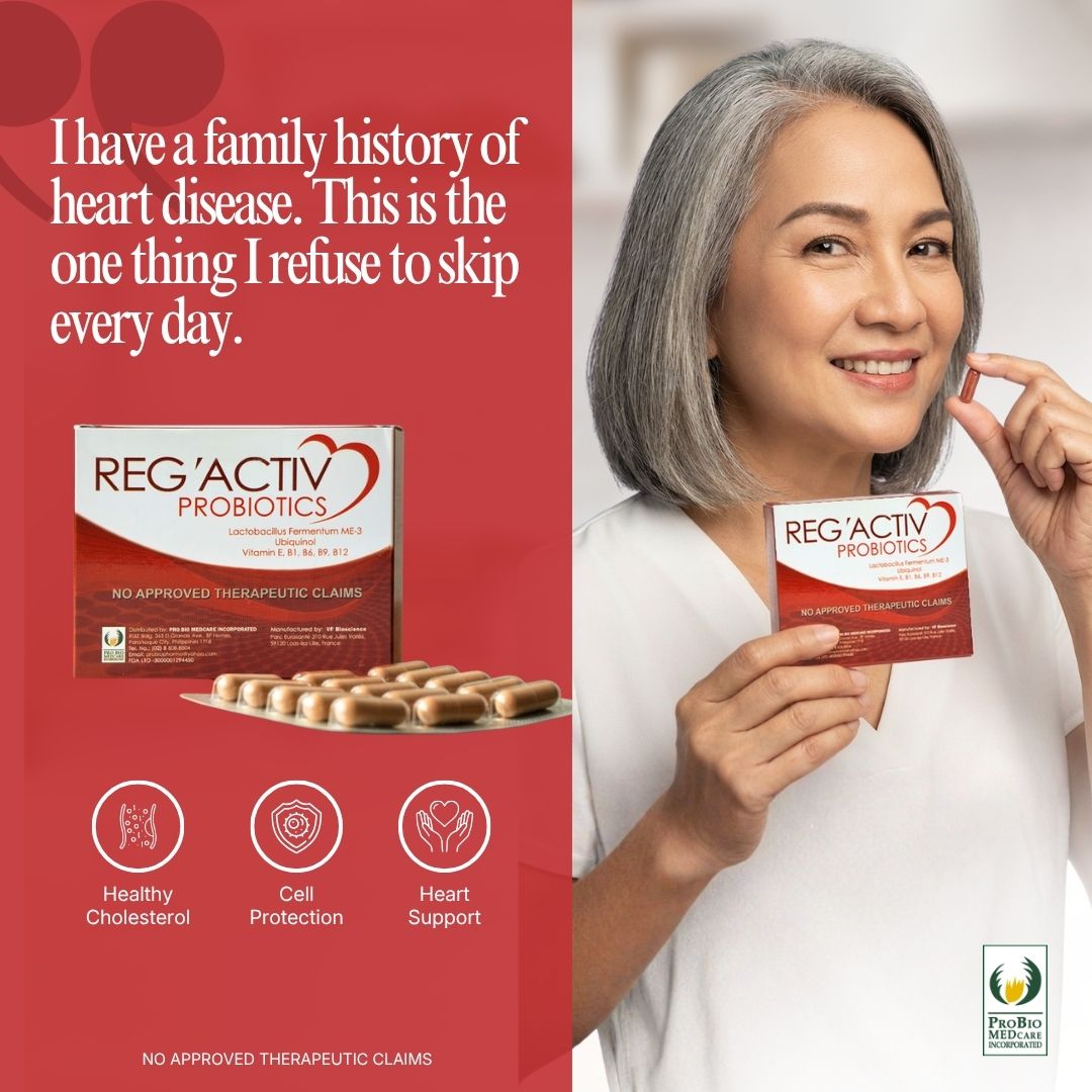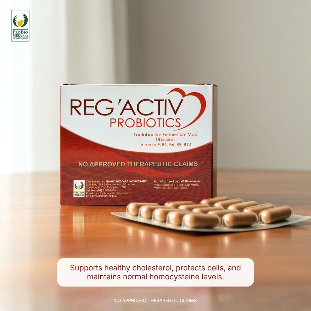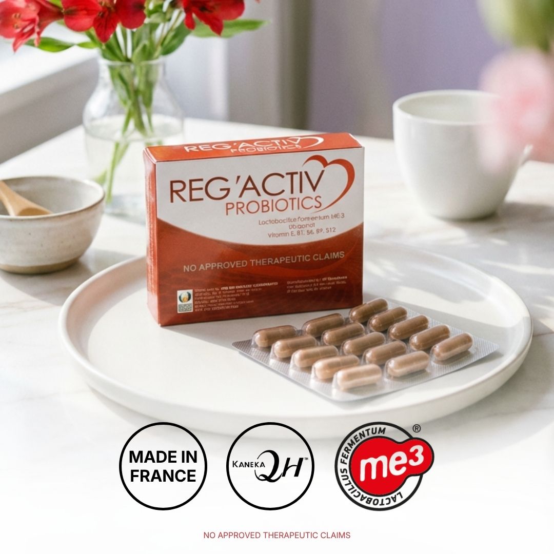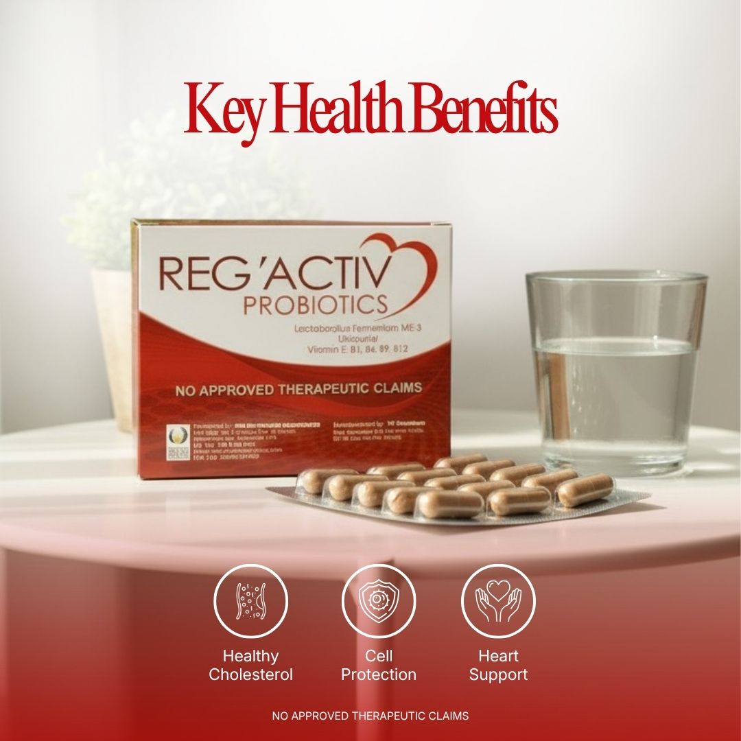 Reg’Activ Probiotics is specifically formulated for cardiovascular health. The main ingredients are Lactobacillus fermentum ME-3, with Red Yeast Rice, Monacolin K, Ubiquinol, Vitamin E, B1, B6, B9, B12. This innovative formulation combines a specific probiotic strain, Lactobacillus fermentum ME-3, with other functional ingredients which exerts a triple effect of lowering cholesterol levels, protection against oxidation, and metabolism of homocysteine.
